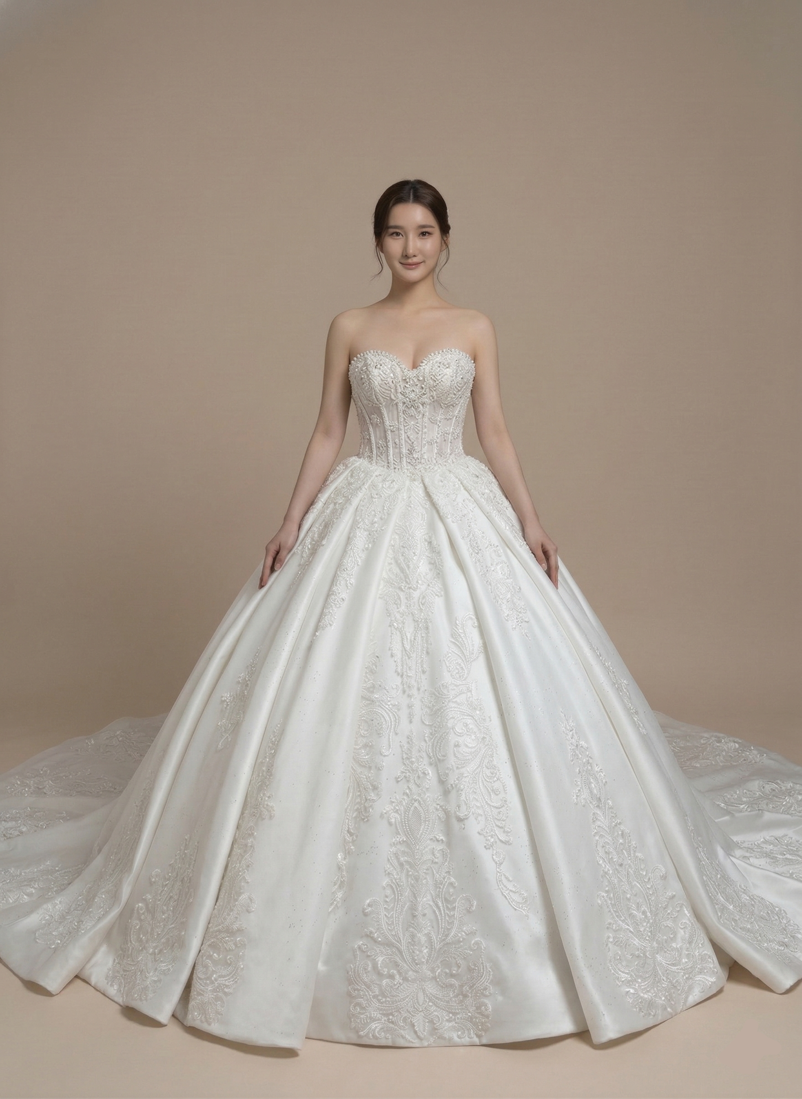 Majestic, structured, and luminous. Designed for the bride who wants to make a truly unforgettable entrance, the Isla features a classic corset-style bodice with visible boning and exquisite pearlescent embroidery. This high-fashion bodice gives way to a grand, heavy-satin ballgown skirt that boasts deep box pleats and intricate scrolling lace embroidery, creating a silhouette that is both powerful and timelessly regal.