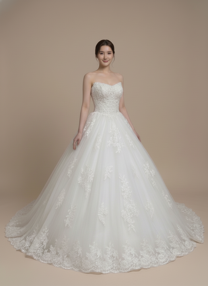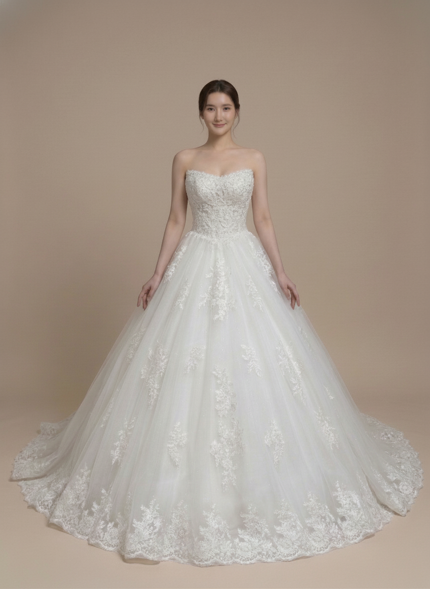 Radiant, classic, and breathtakingly romantic. Designed for the bride who wants a timeless silhouette with a luxurious touch of detail, the Luna features a beautifully structured sweetheart bodice adorned with fine lace embroidery. The lace cascades gracefully onto a voluminous tulle ballgown skirt, which is finished with an exquisite scalloped lace hem that adds a regal frame to every step.