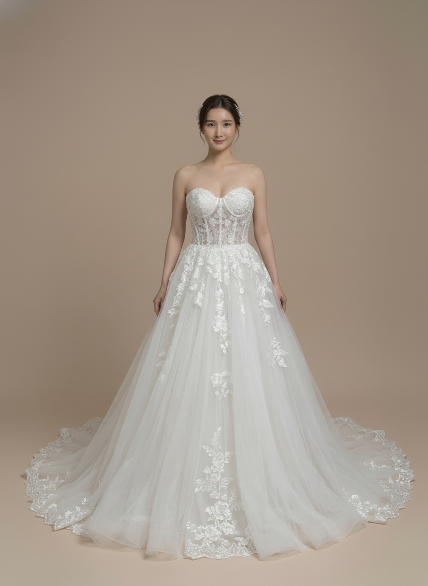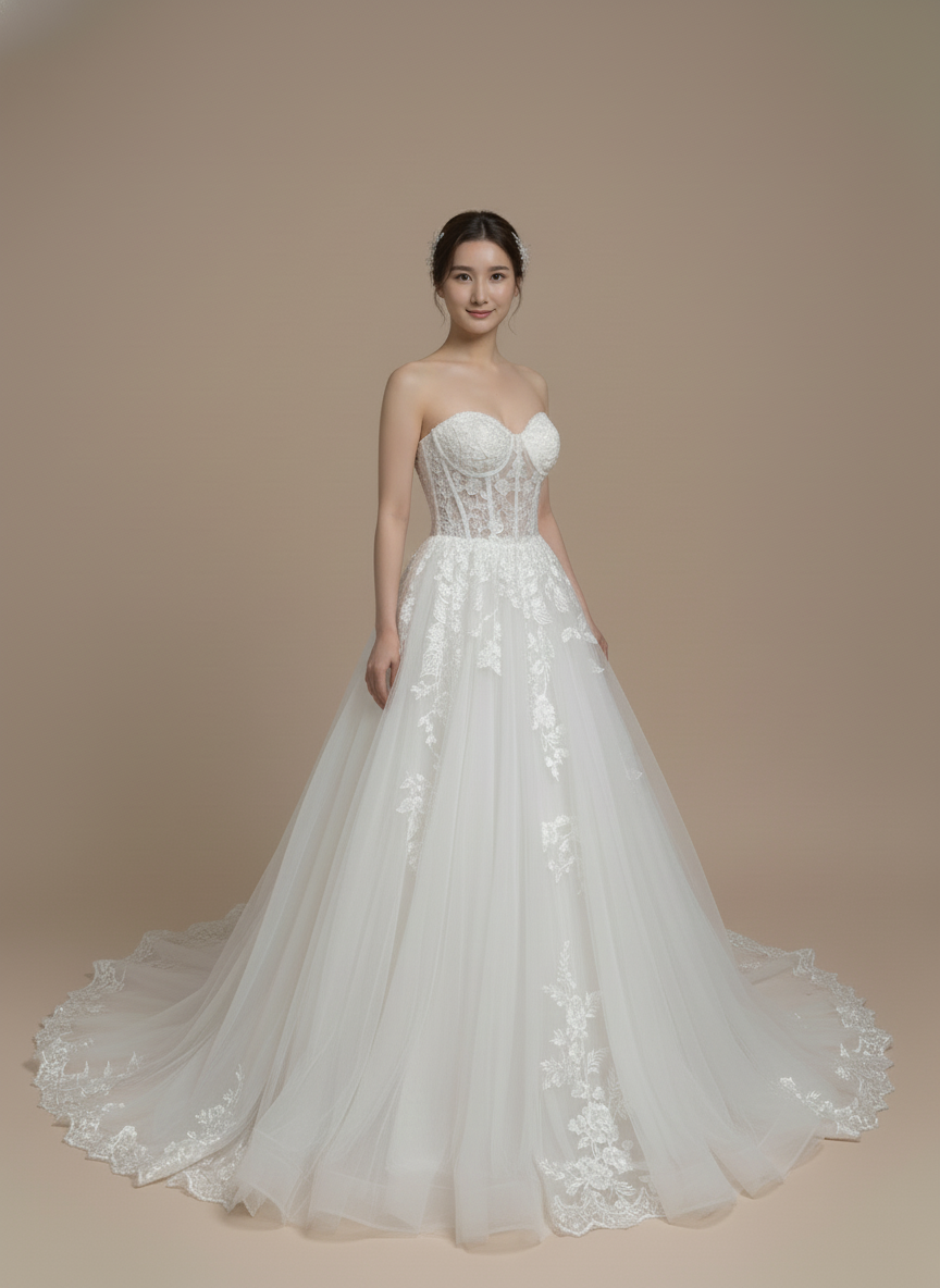 ✨ Neckline: Sculpted Sweetheart with corset detailing