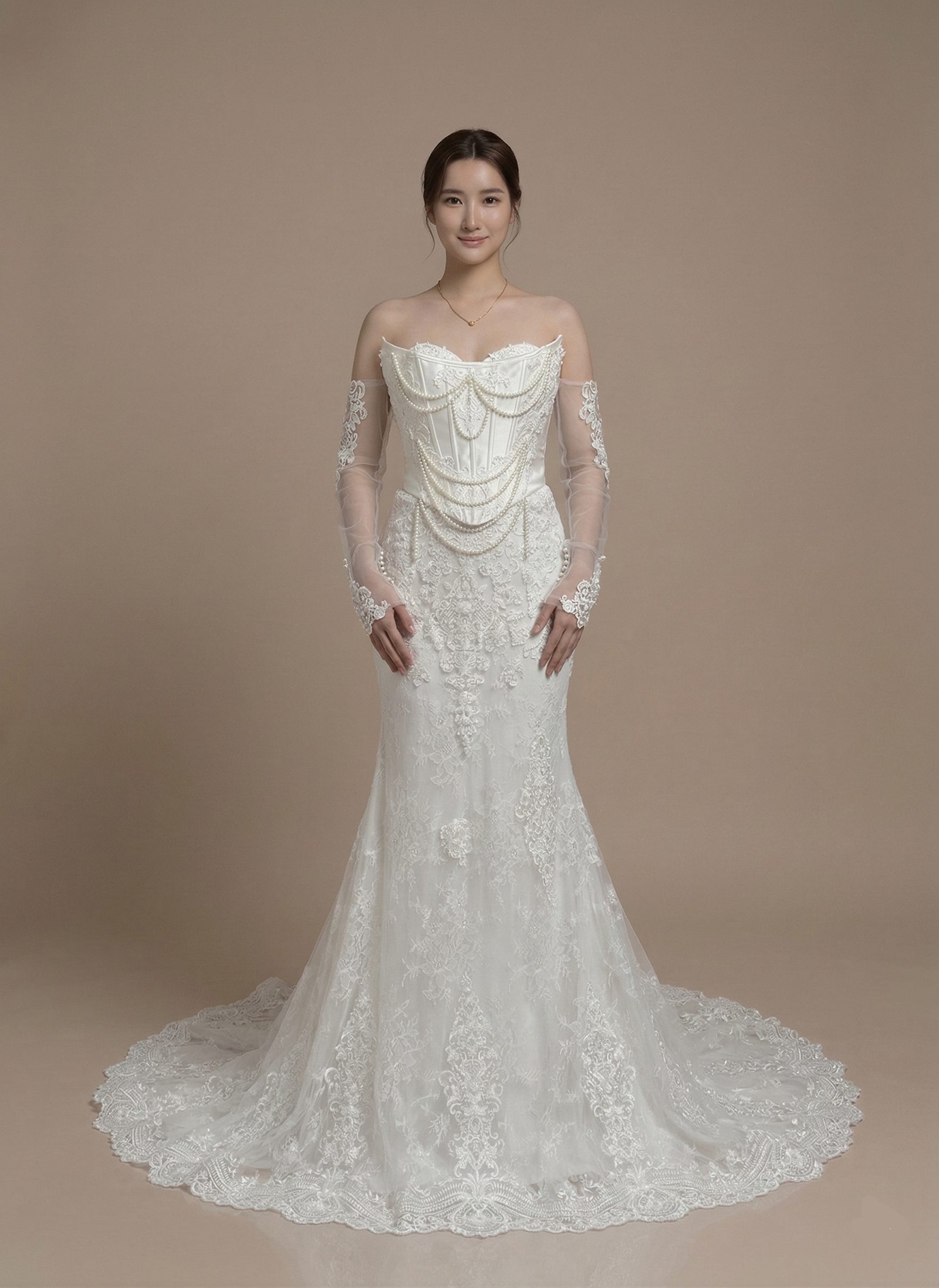 Statuesque, glamorous, and exquisitely refined. The Valencia Gown is a masterclass in contour and contrast, designed for the bride who wants to blend high-fashion allure with regal sophistication. This gown features a meticulously structured strapless bodice with ornate, corset-inspired beadwork that sculpts the form, leading into a striking basque-style waistline. The silhouette is a dramatic, sinuous mermaid profile, crafted from rich, luminous satin. It fits perfectly through the bodice, hips, and thighs before exploding into a magnificent, voluminous box-pleated skirt and sweeping train.